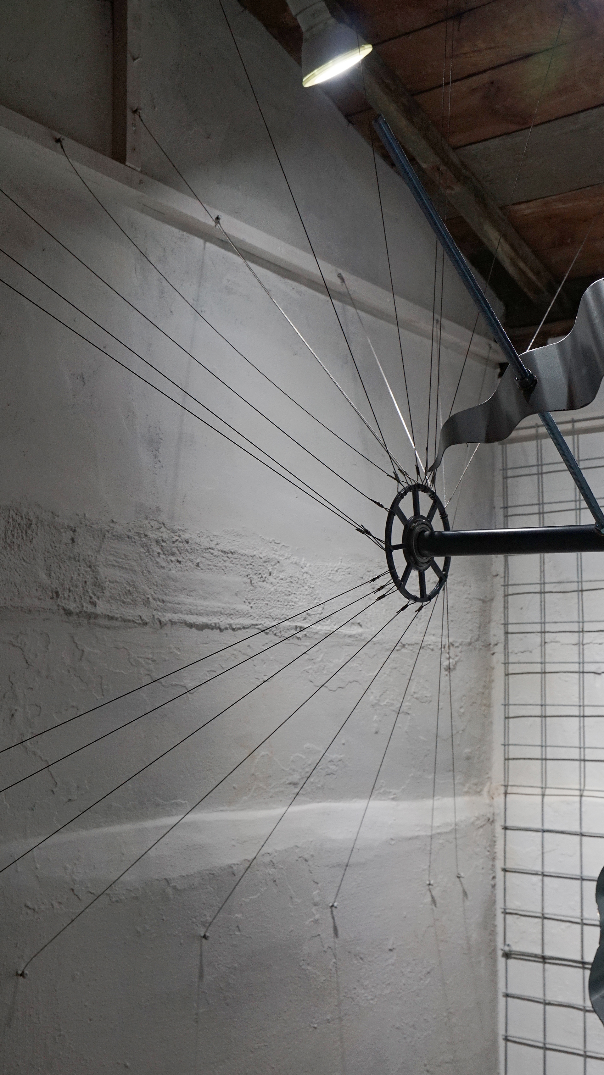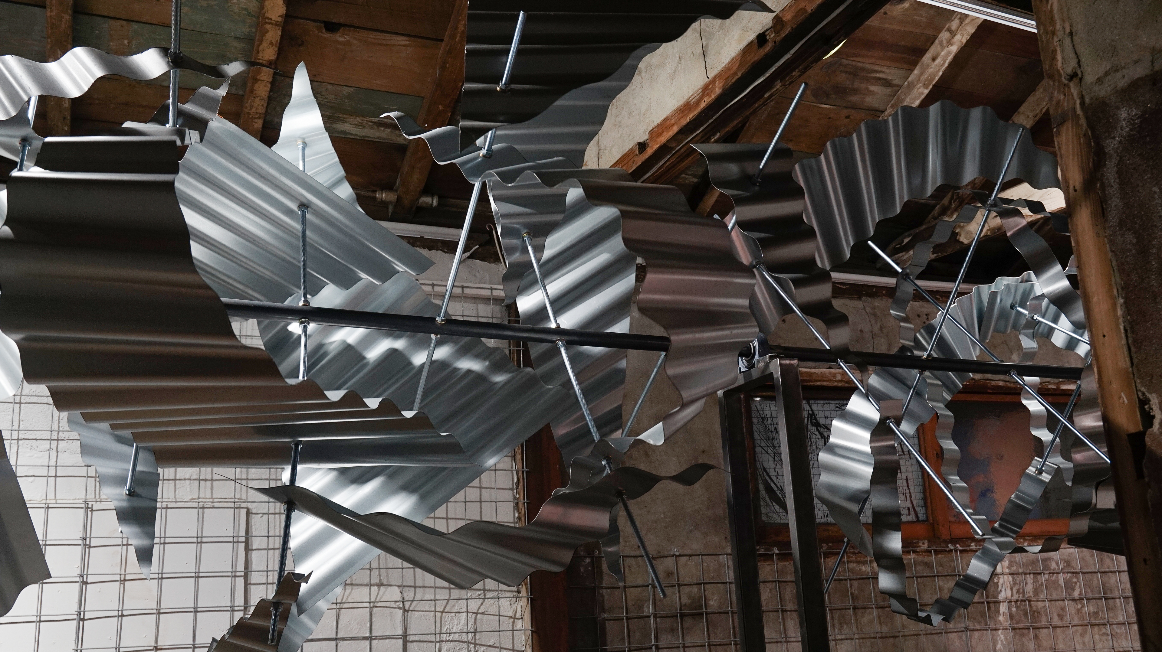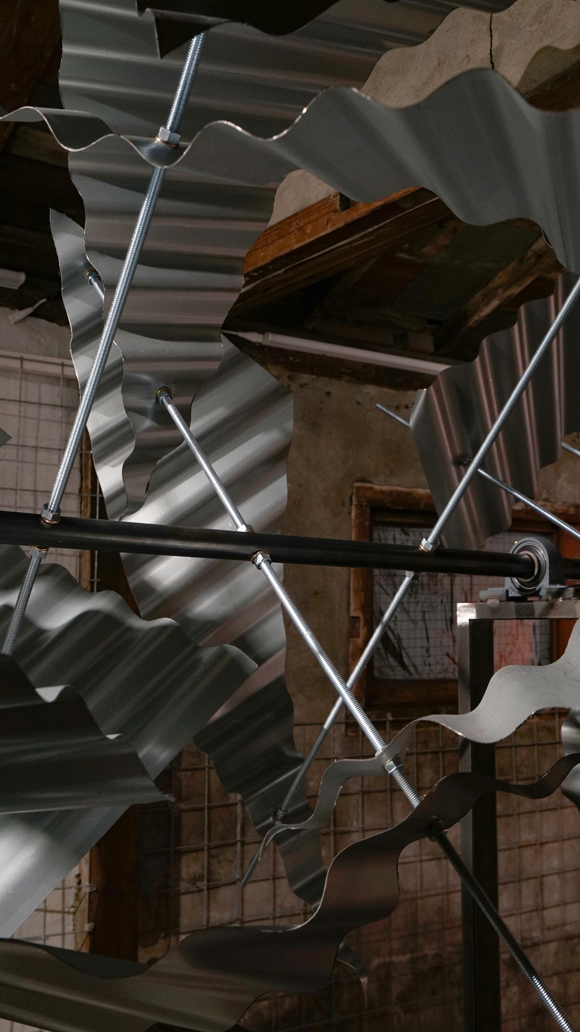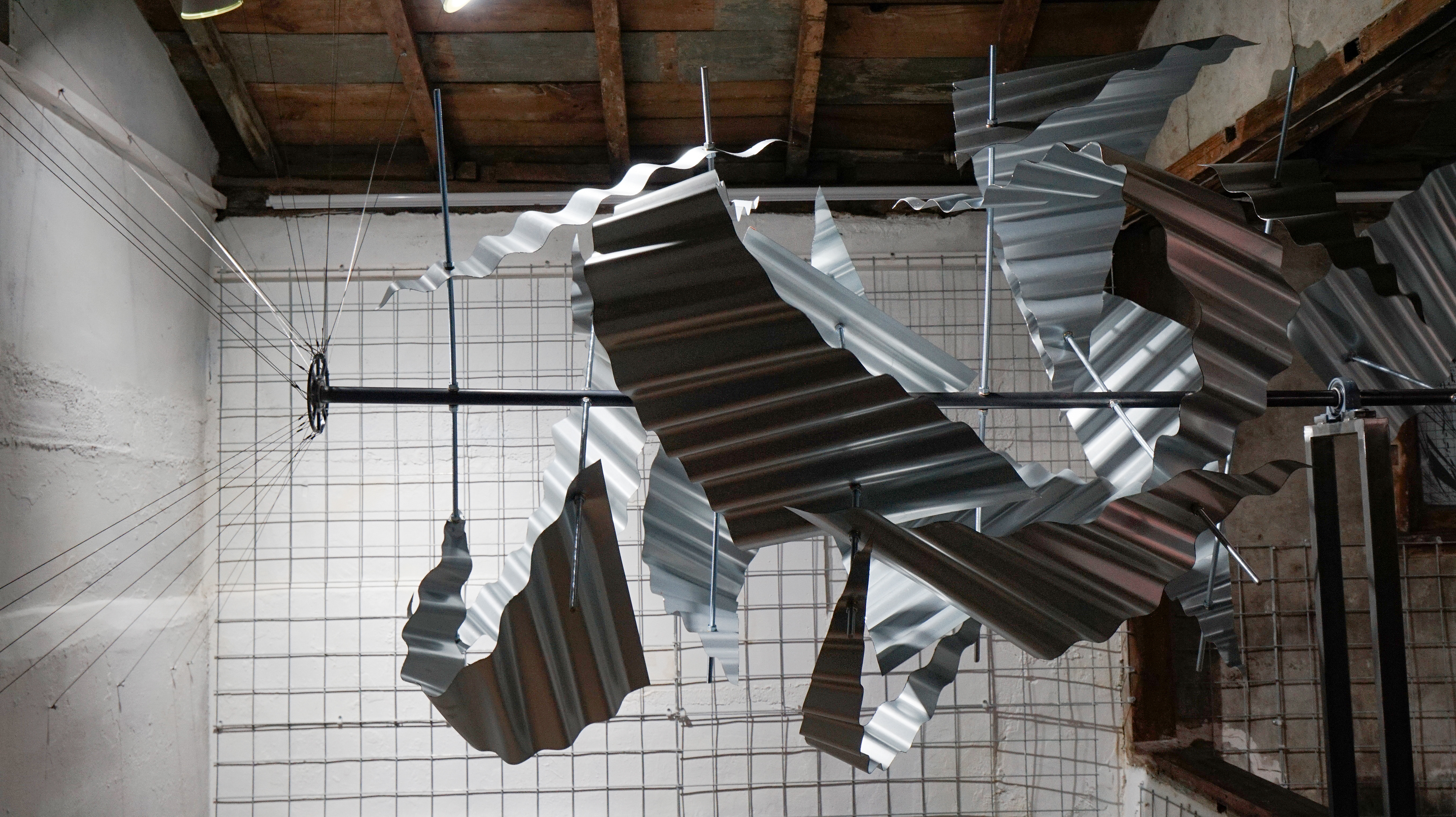 슬레이트 철판, 나무 각재, 철 구조물, 와이어, 모터