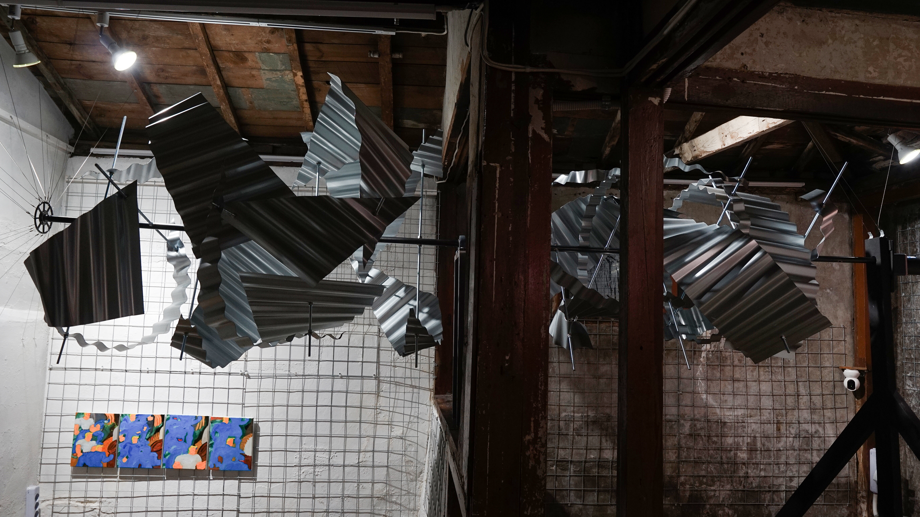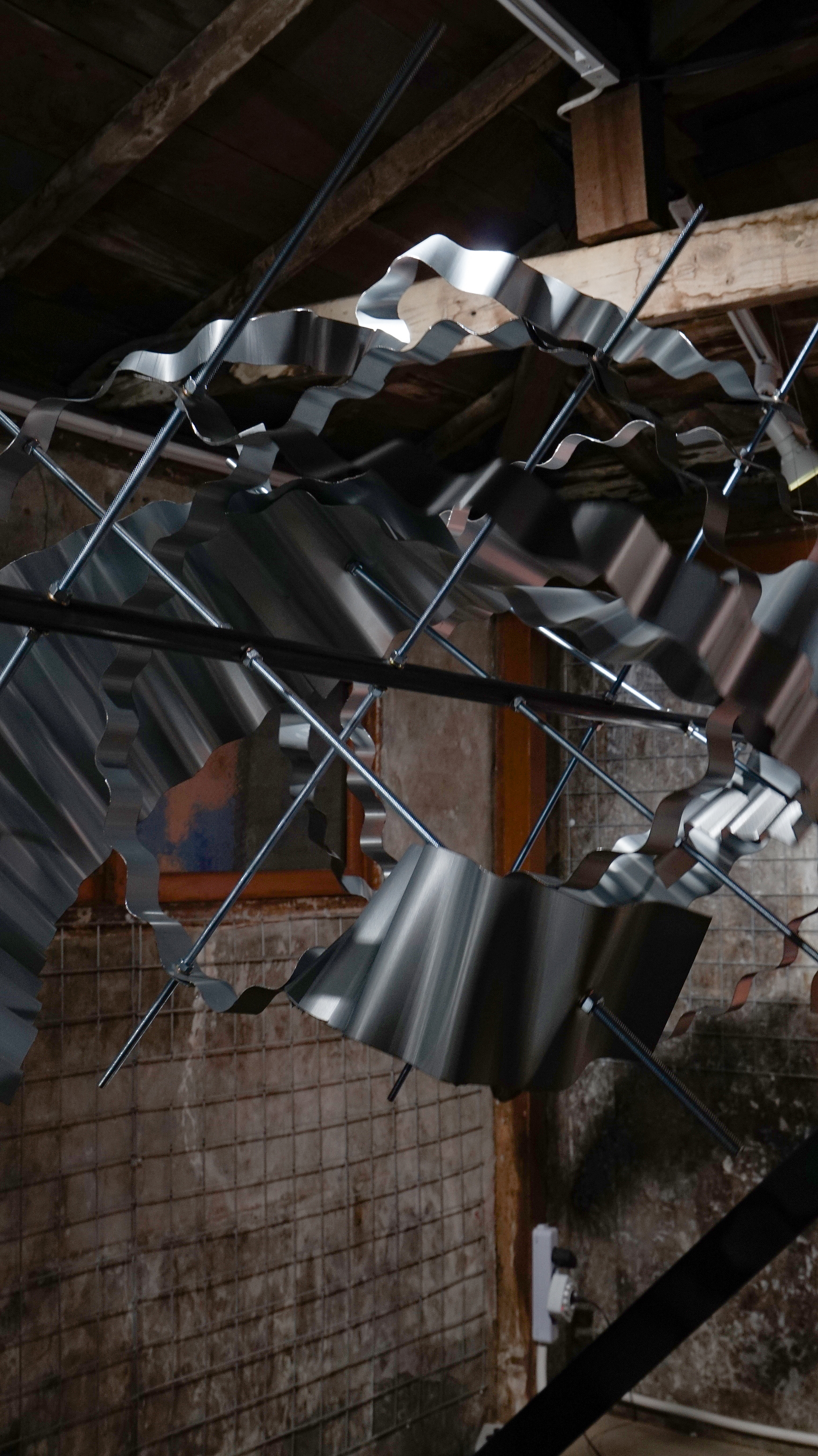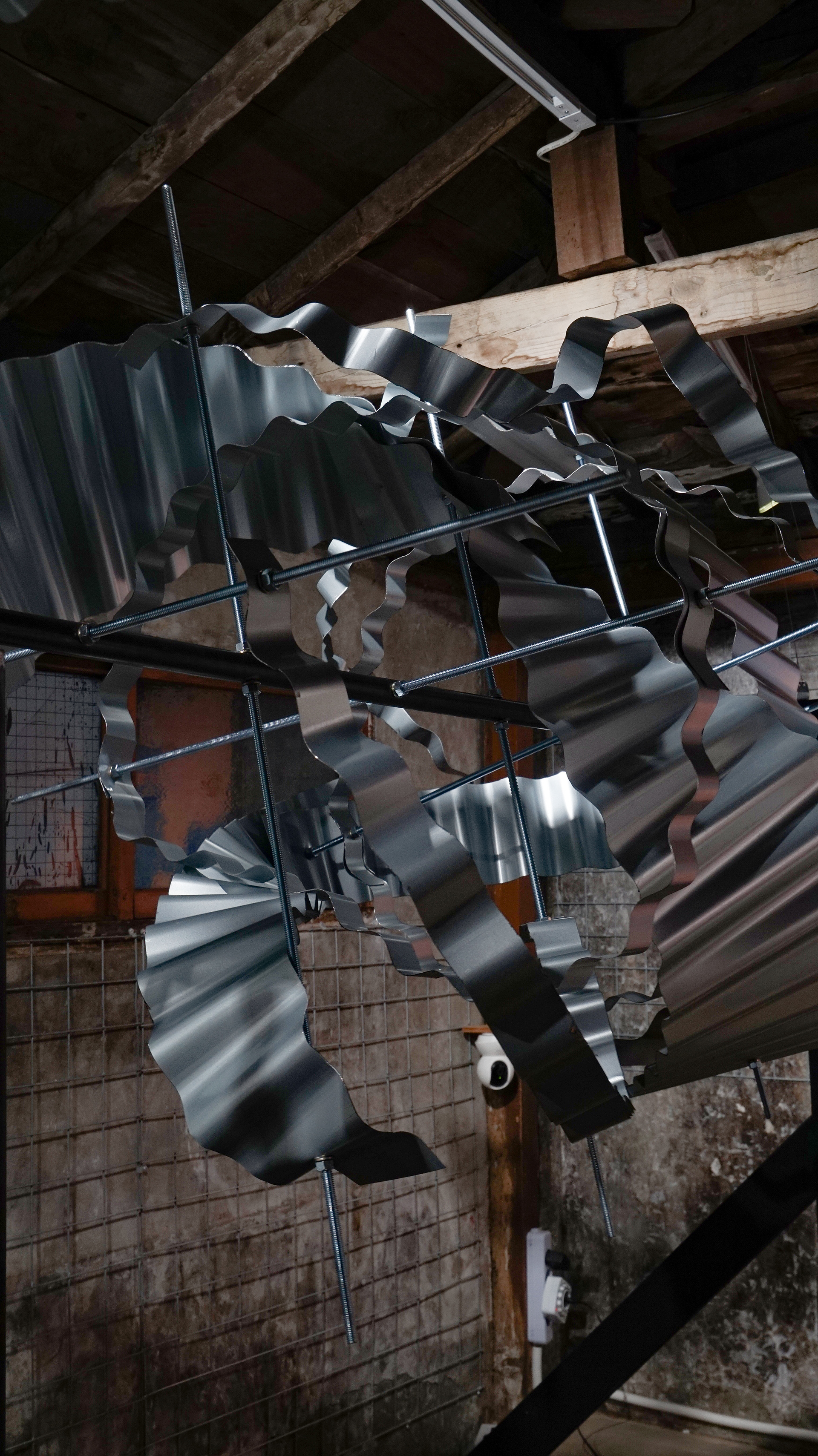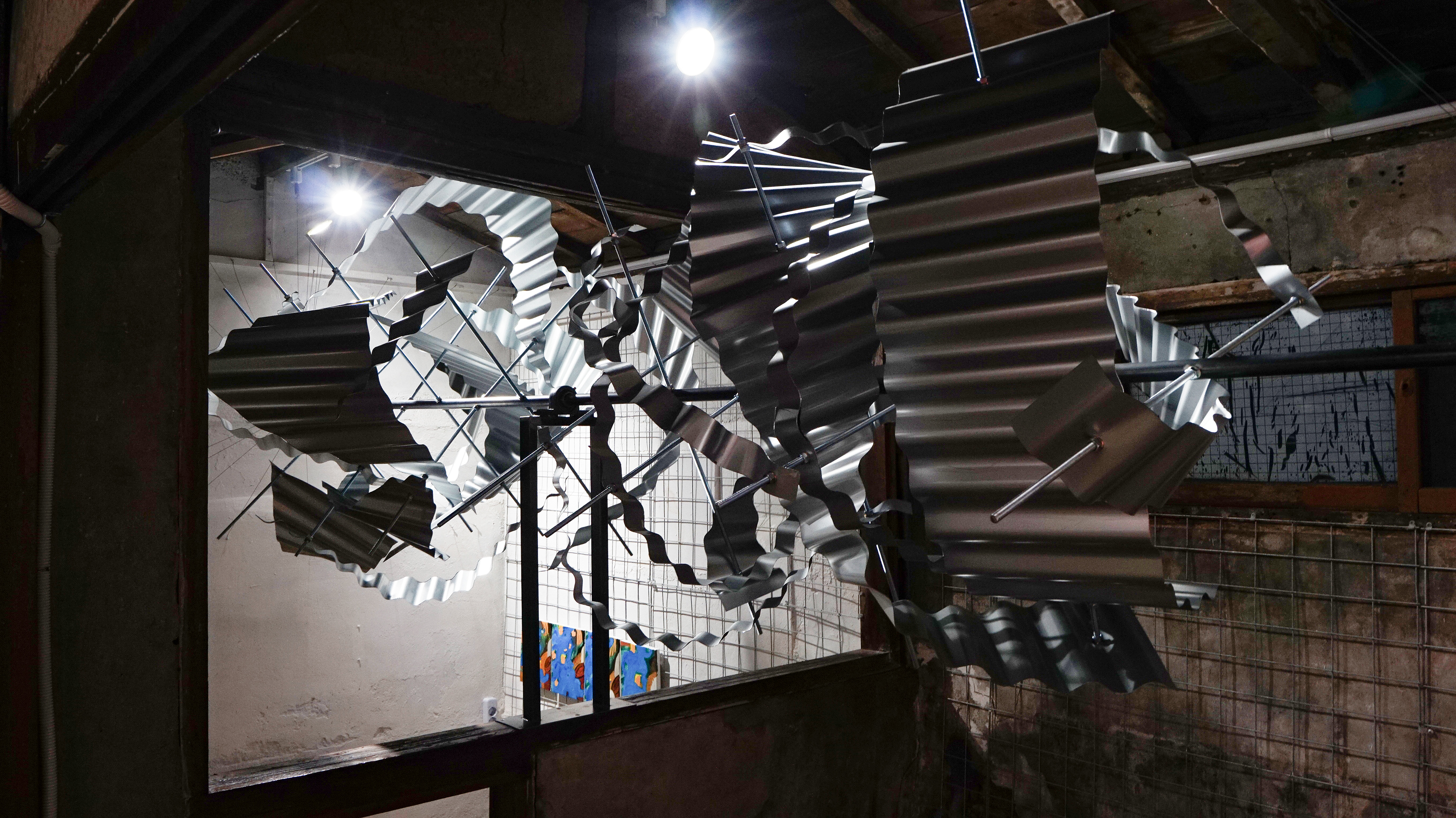 슬레이트 철판, 나무 각재, 철 구조물, 와이어, 모터
